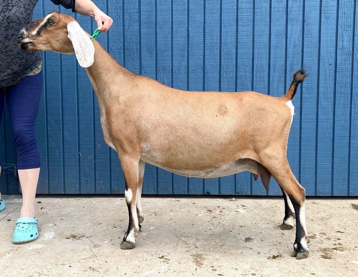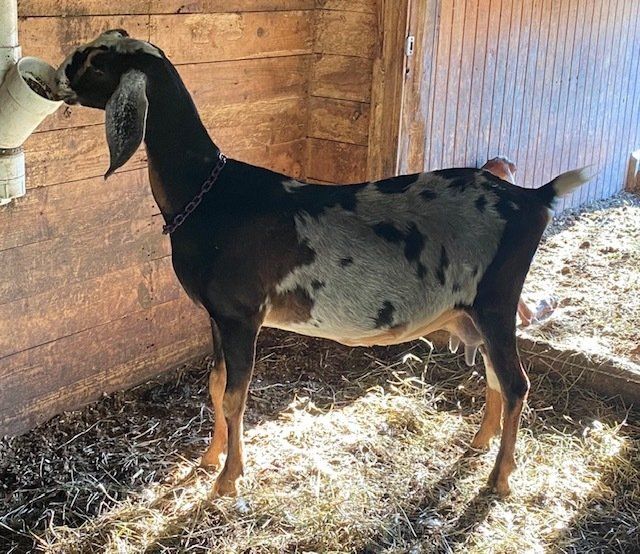 Duchess (DAM) made the Elite doe list AGAIN this Summer! She is another doe that is linked to Six M Galaxy Nova's Sonia Noel. Her grand dam is the infamous Crow's Dairy Blue Sparkles, multiple time top ten doe, and daughter of Noel's Comet, elite sire with one of the highest milk PTAs there has ever been! Duchess's sire, Six M Galaxy Pecos Bill, is a son of Sonia Noel Daughter, Noel's Holly. Once again, adding Sonia Noel into the pedigree. Duchess has been a strong gallon milker during her lactation, and has a willing attitude to milk. Our favorite characteristics of this doe are her level topline, great rear leg angles, supple udder texture, and ease of milking.